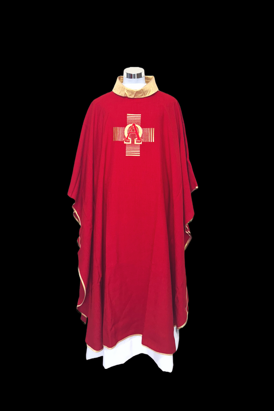 Casulla de lana con bordado central y líneas decorativas