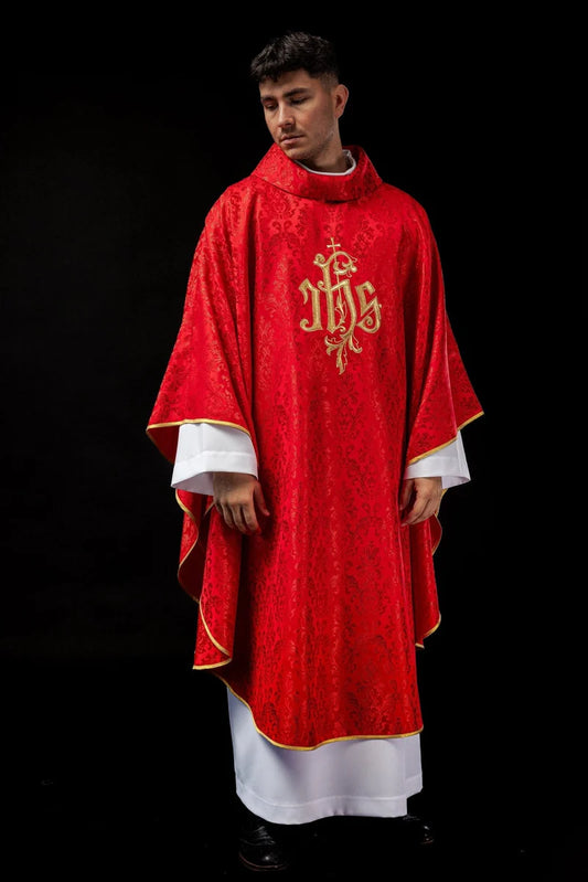 Casulla bordada de color crudo con símbolo mariano y cuello ancho