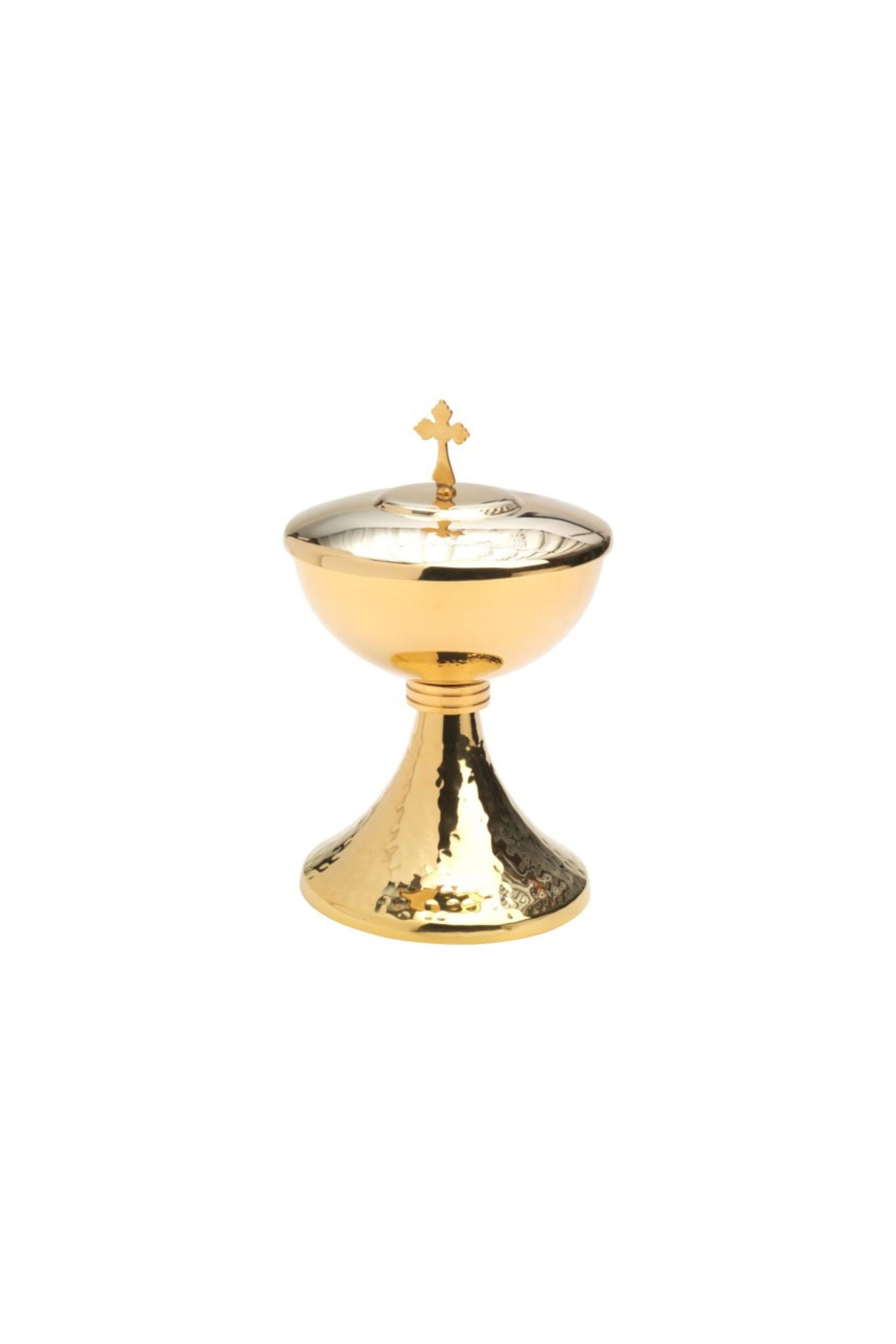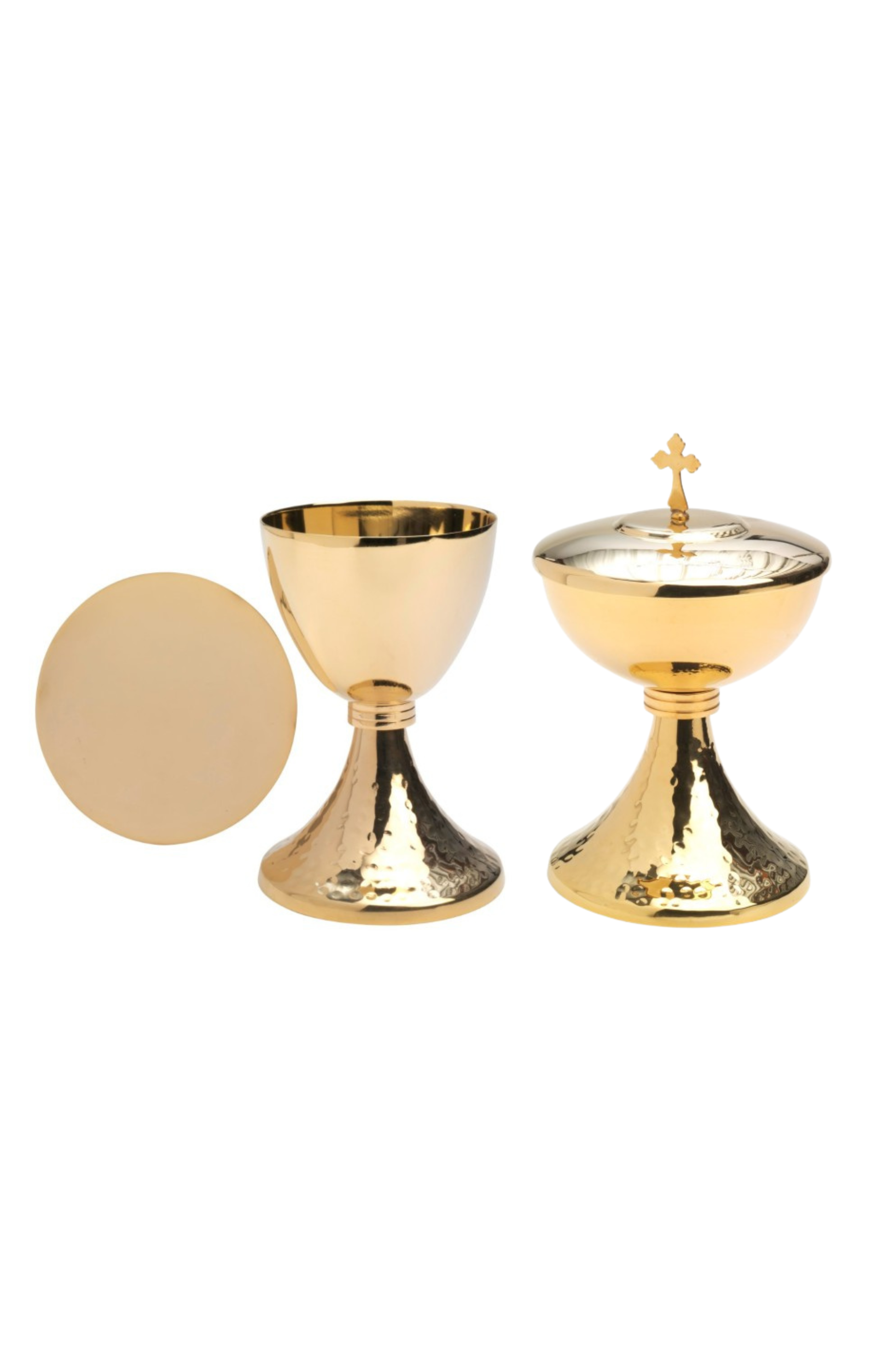 Cáliz con patena y Copón Dorado con base martillada