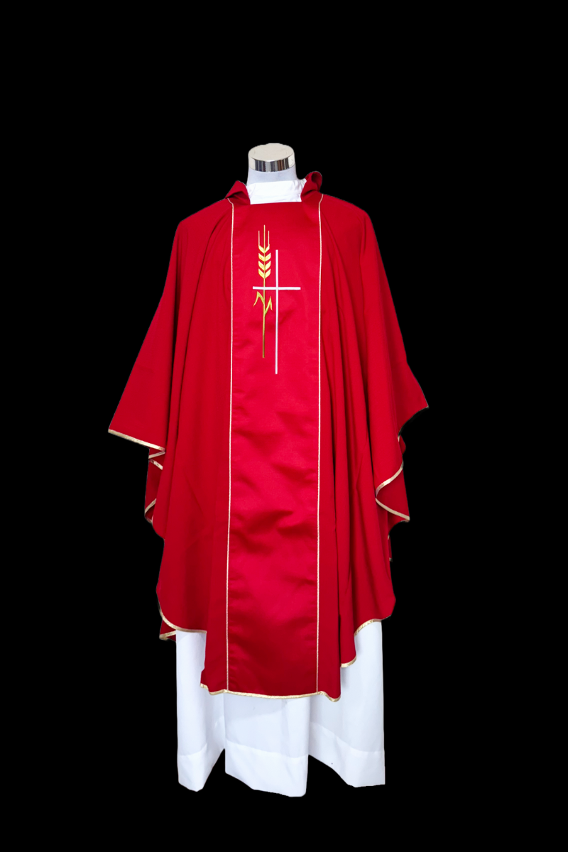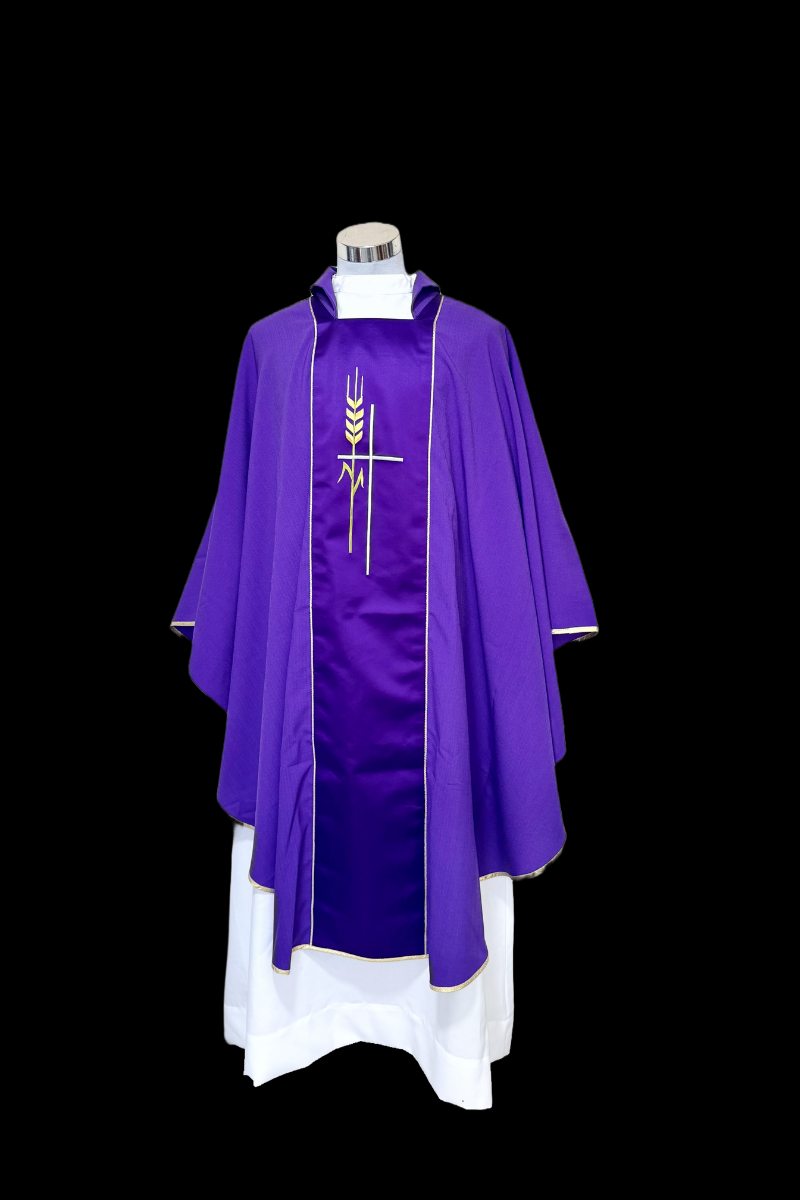 Casulla de lana bordada con cruz y trigo, confeccionada completamente de poliéster, importada de Europa.