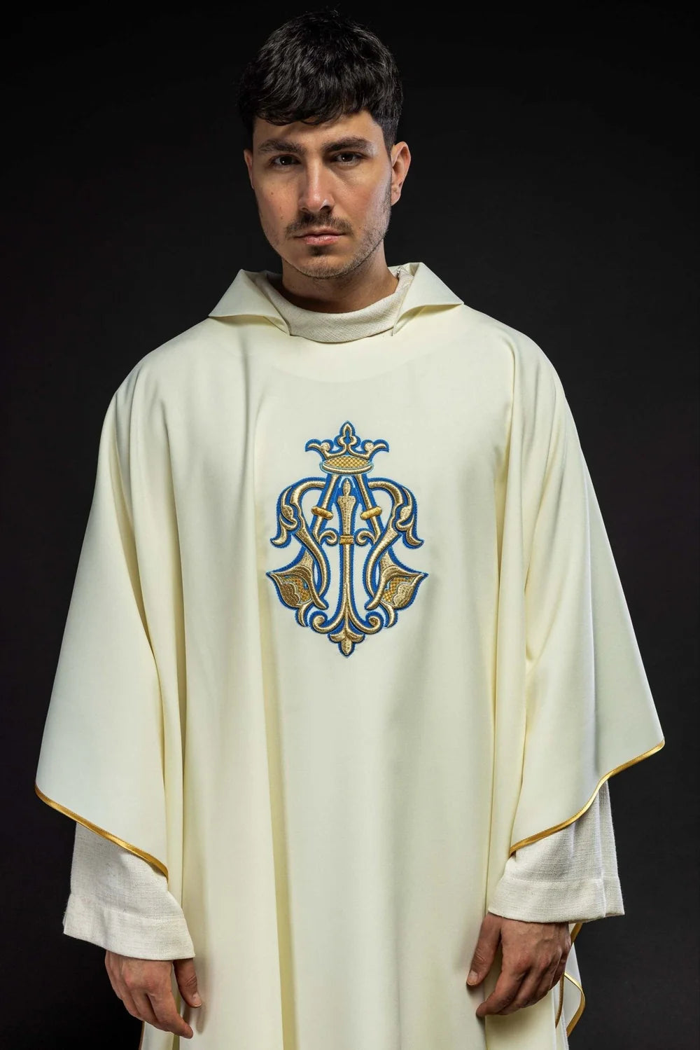 Casulla bordada de color crudo con símbolo mariano y cuello ancho